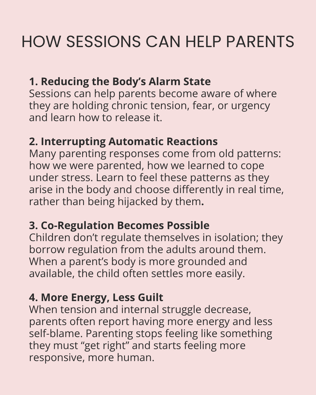 It often makes sense for parents themselves to receive sessions. Not because the parent is “the problem,” but because parenting happens through the body, not just the mind.