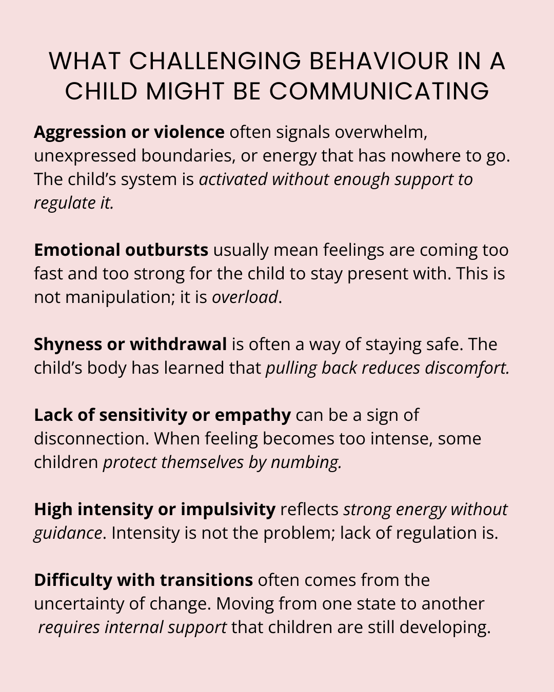 Children express through their bodies what they cannot yet regulate, understand, or verbalise. Behaviours such as aggression, emotional outbursts, withdrawal, or extreme intensity are seen as adaptive responses to discomfort, not signs of a “difficult” child.