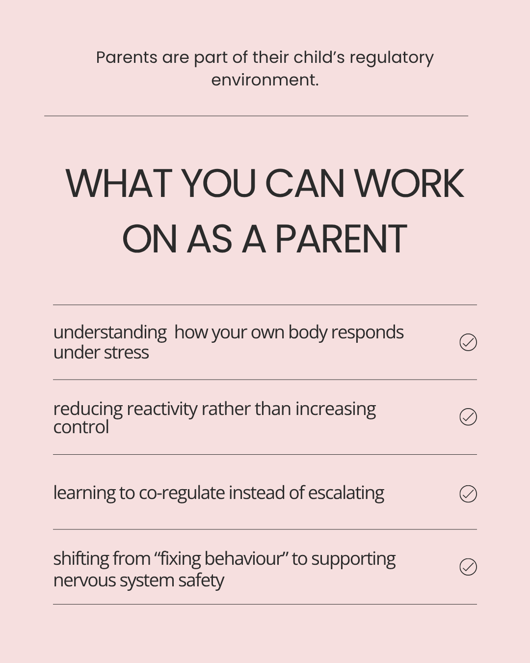 Parents are part of their child’s regulatory environment. When a parent is overwhelmed, triggered, or exhausted, it makes regulation harder for everyone. This is not a failure, it’s called being human.