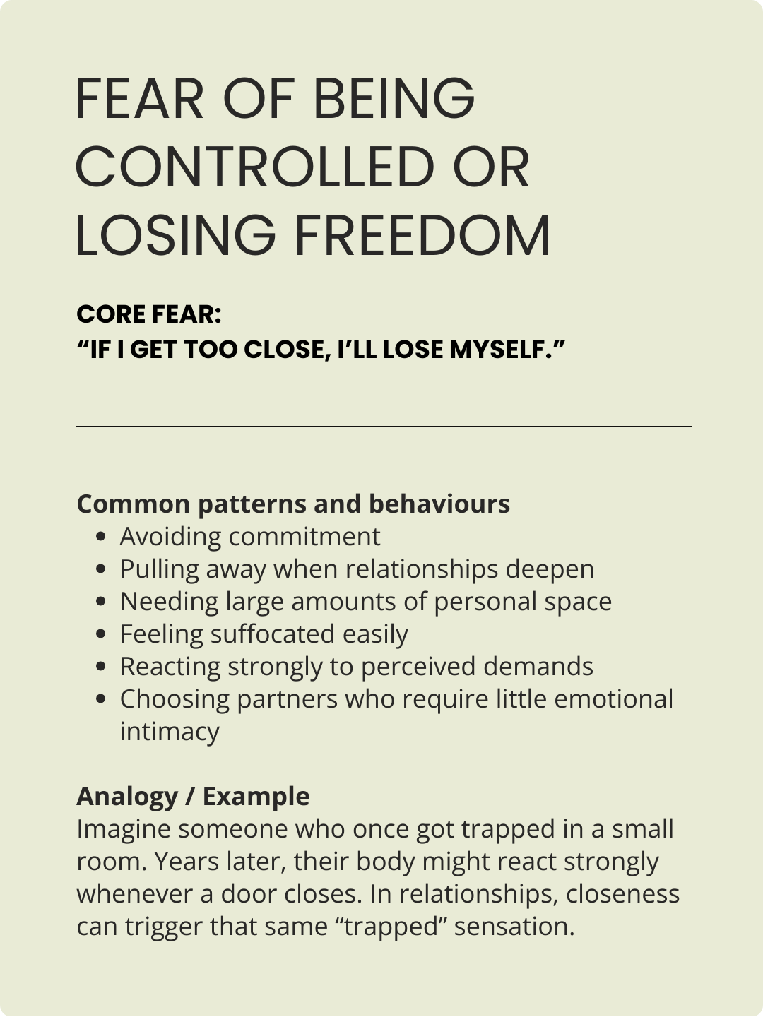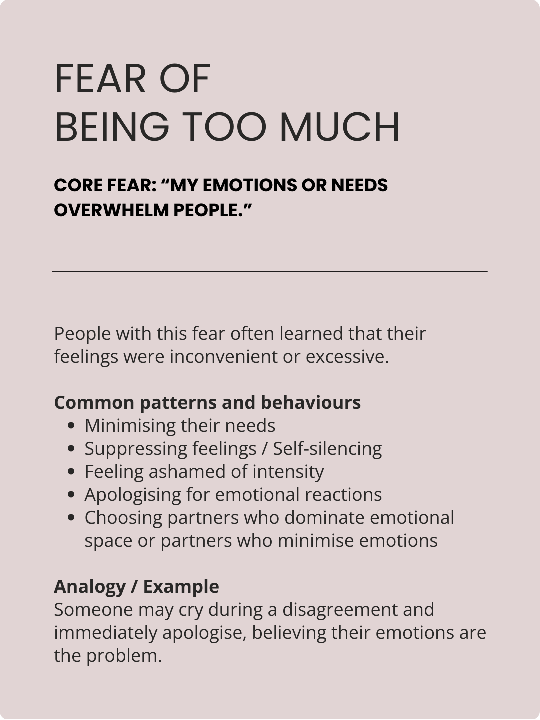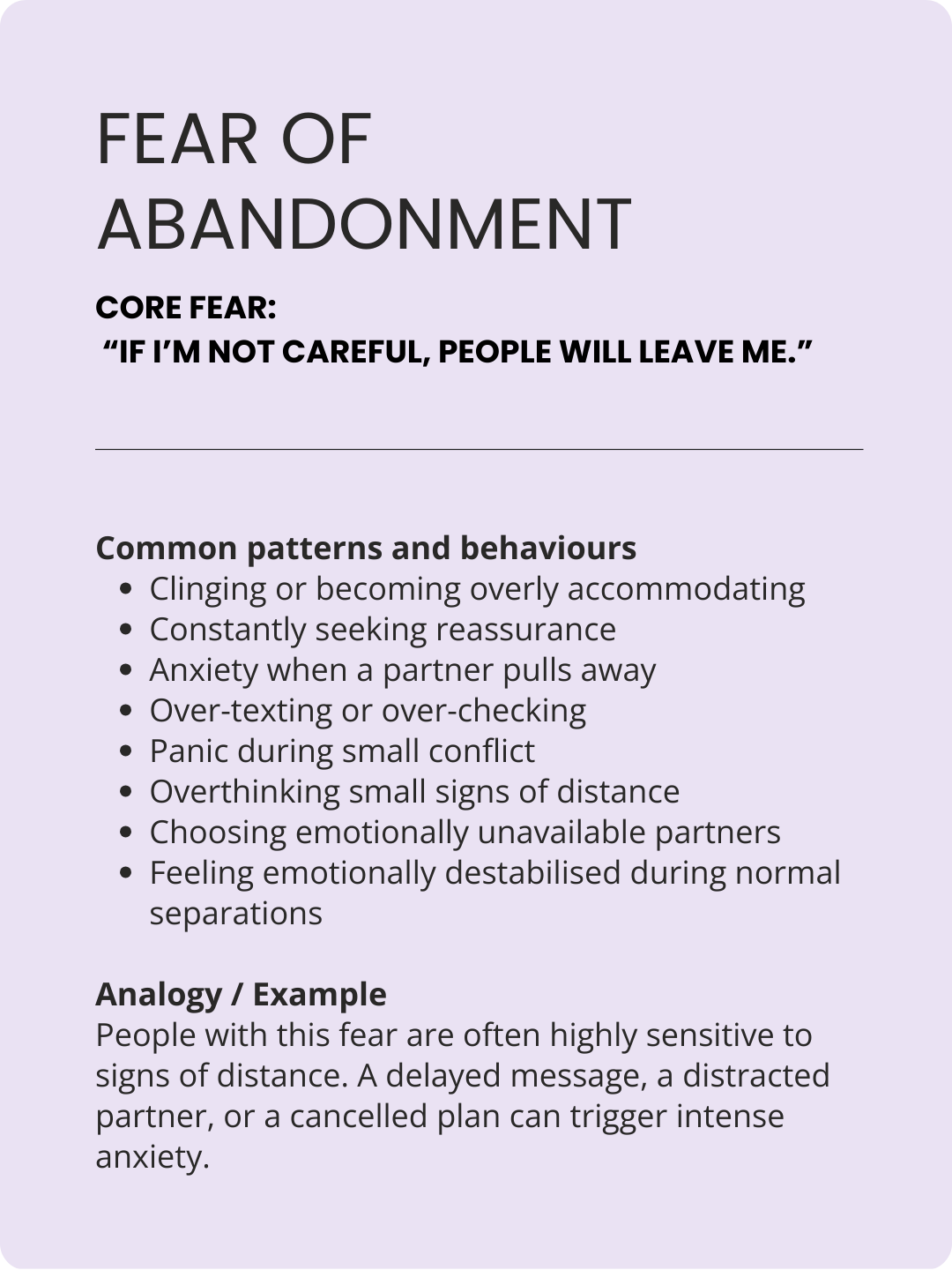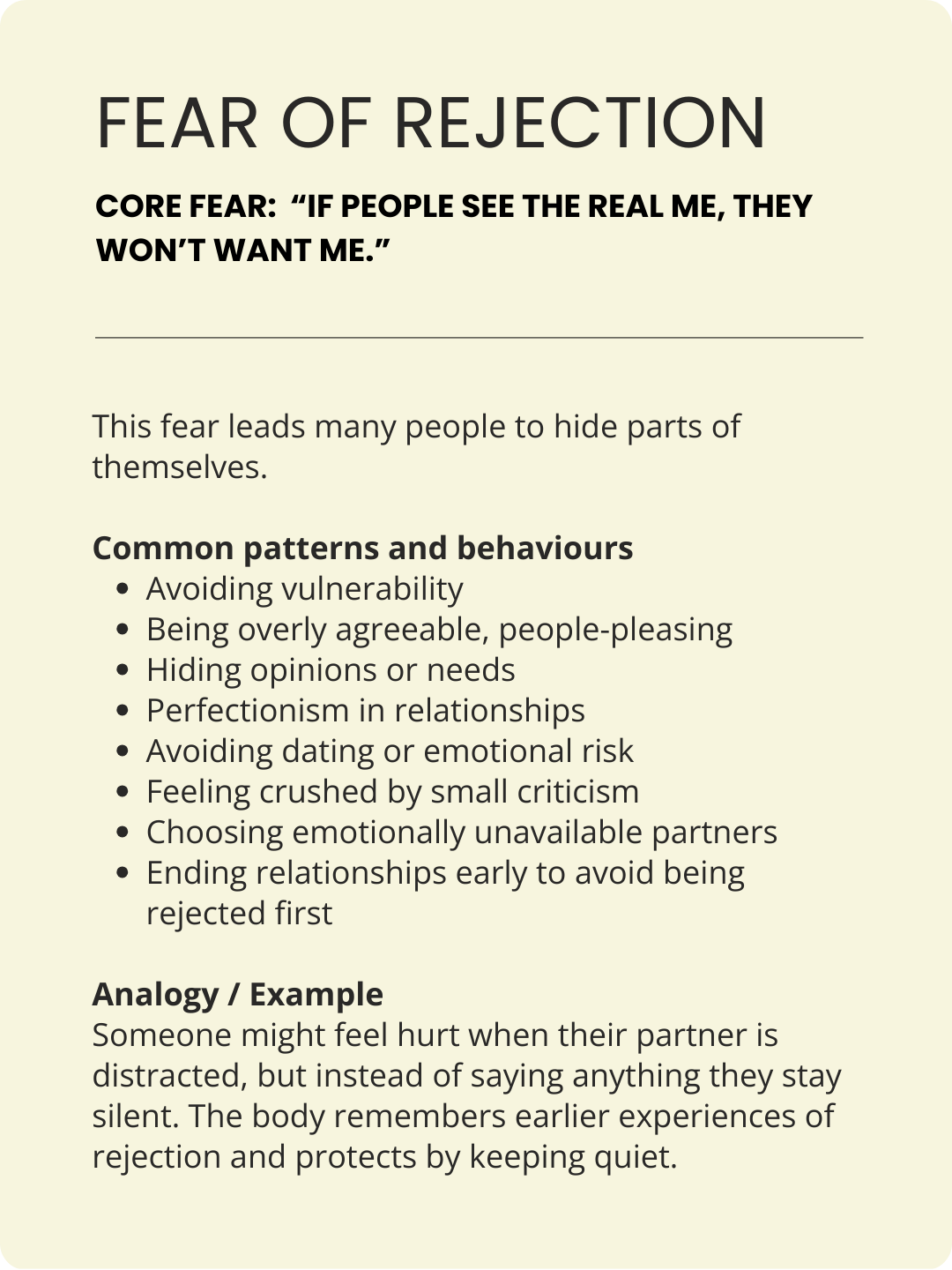 Most people see themselves in 2-3 of these patterns and , some fears trigger the same behaviours so they might look the same on the outside.