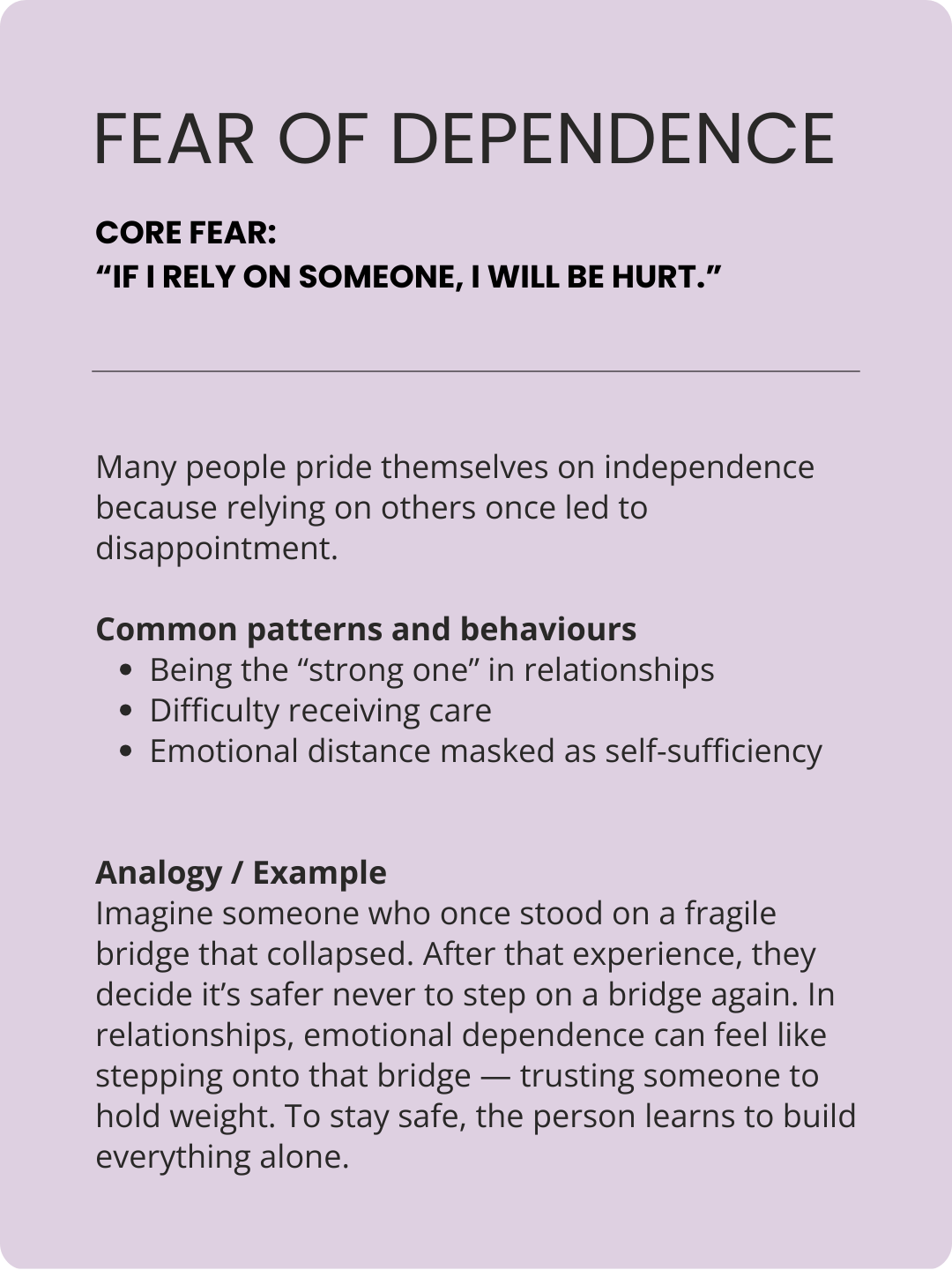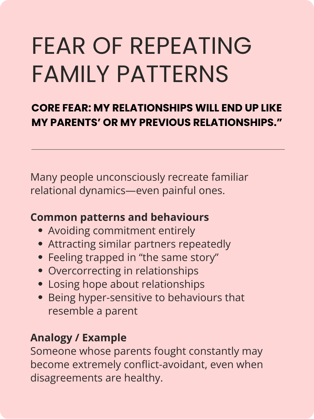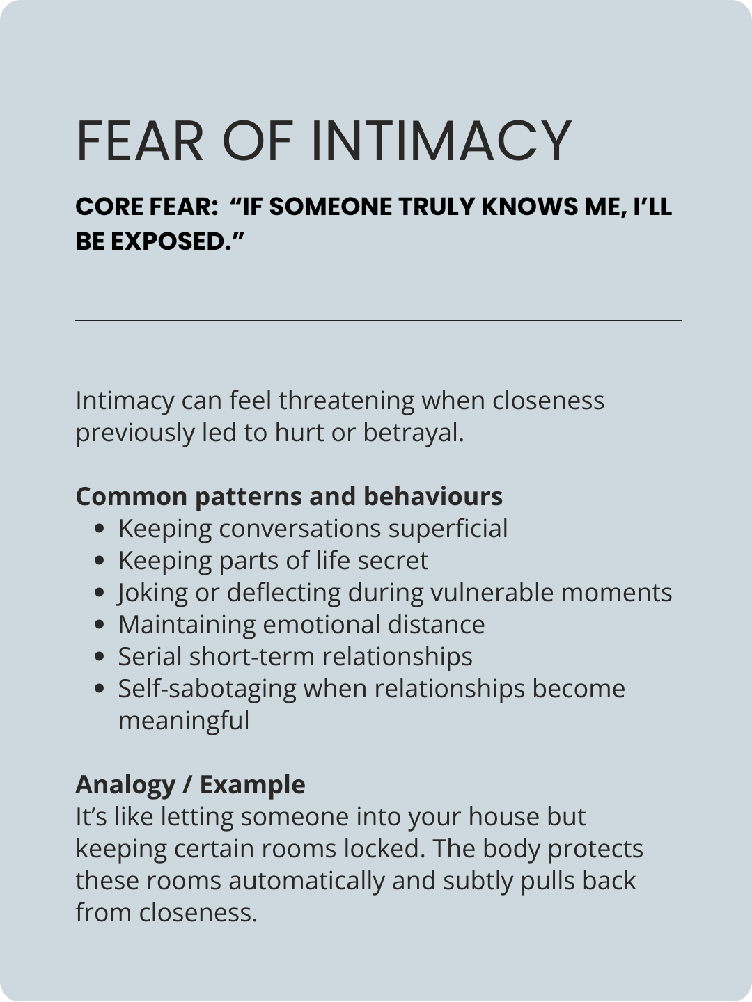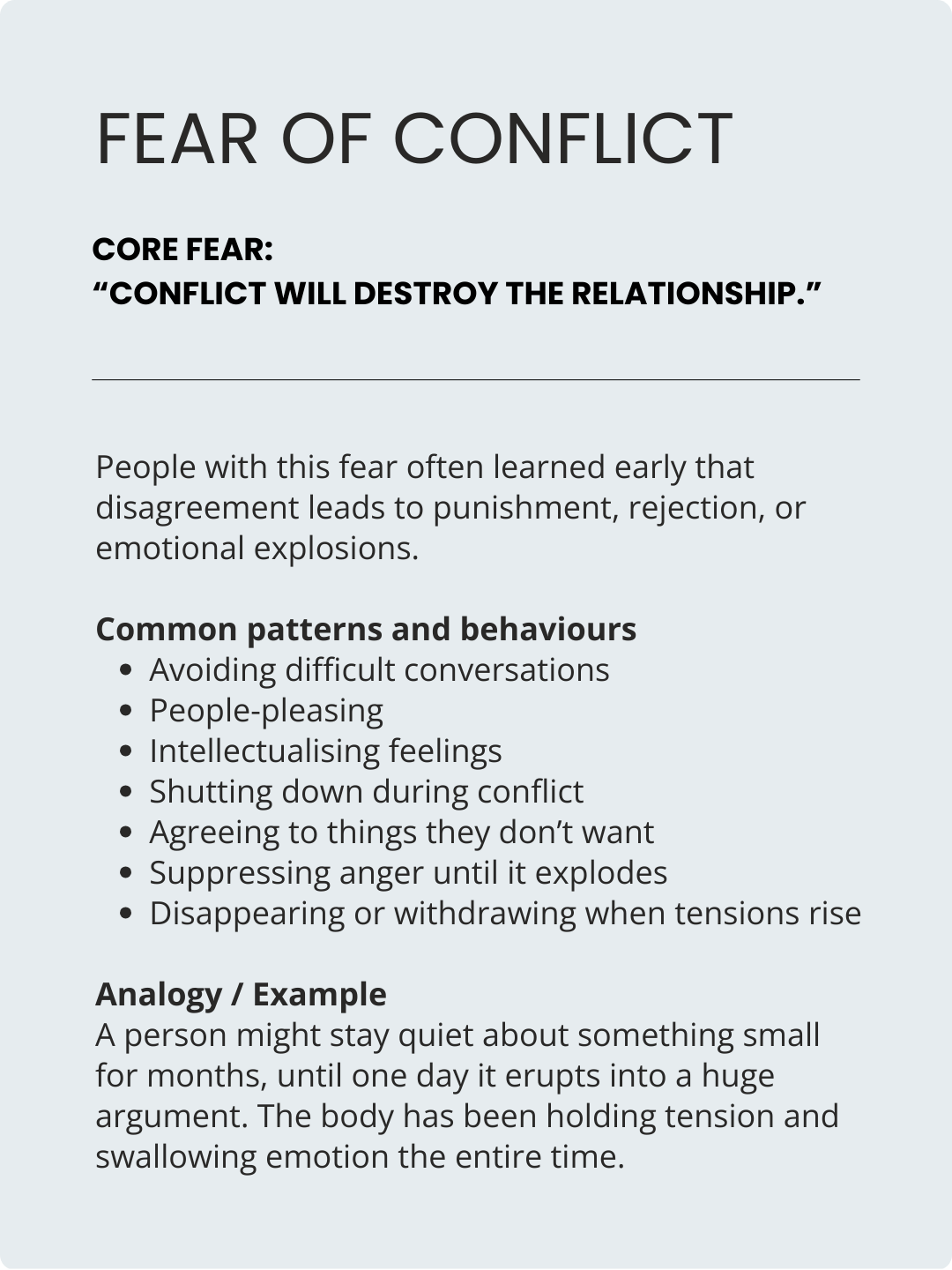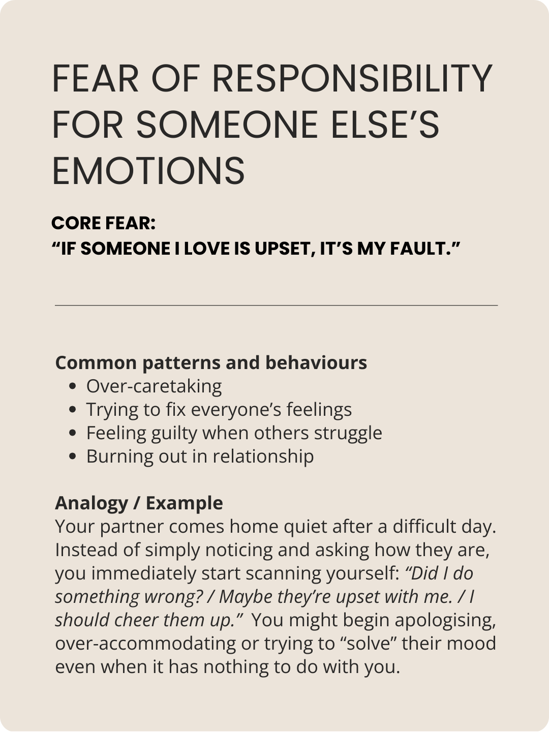 Most people see themselves in 2-3 of these patterns and , some fears trigger the same behaviours so they might look the same on the outside.